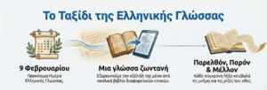 Ένα ταξίδι σύντομο, γλωσσικό, εκπαιδευτικό, πολιτισμικό και ανθρώπινο. Γιατί η γλώσσα, πέρα από λέξεις, είναι ο τρόπος που βλέπουμε τον κόσμο σήμερα και ταυτόχρονα μας βοηθά να βλέπουμε και τον κόσμο του χθες, τα χιλιάδες «χθες» που μας έφεραν στο σήμερα.
